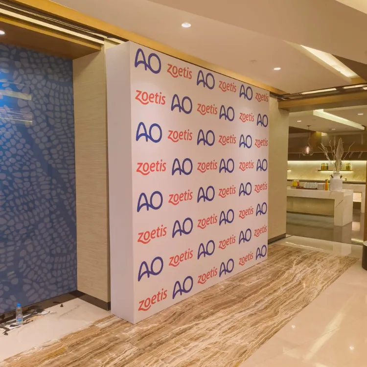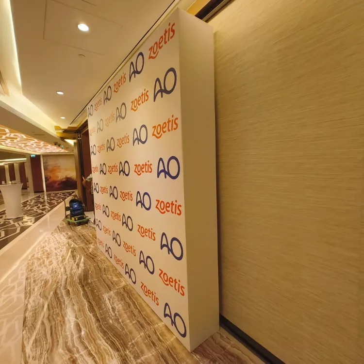 Wooden backdrops with a sticker design offer versatility and the opportunity for intricate, customized designs. Perfect for trade shows, corporate events, or promotions, this design involves applying printed stickers in sections, allowing flexibility in showcasing your branding. Whether you need specific logos, images, or text, stickers make it easy to personalize the backdrop for any occasion. This option is ideal for events where creativity and uniqueness are essential, offering an easy setup and long-lasting visual appeal.
