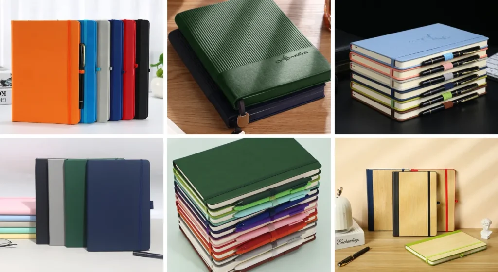 Common notebook types include hardcover notebooks, spiral notebooks, eco-friendly notebooks, bamboo notebooks, cork cover notebooks, and general customised notebooks.