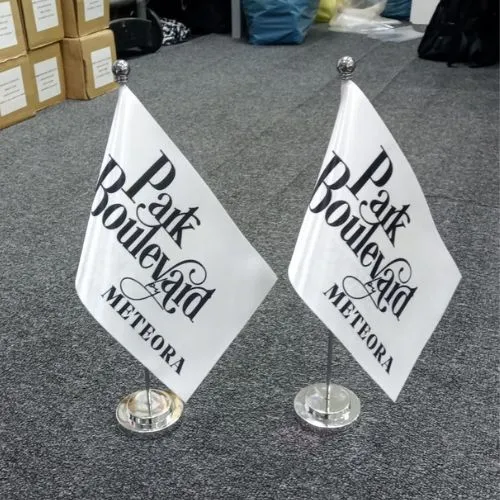 Professional table flag printing uses high-resolution digital and dye-sublimation methods to deliver rich colours, crisp edges, and smooth fabric that holds its shape throughout the day. Whether placed in a meeting room, reception desk, or conference setup, each custom table flag is produced to stay neat, upright, and visually clear. From traditional rectangular desk flags to themed designs such as mini teardrop flags or blade-style table flags, our customisation options help your branding stand out easily.