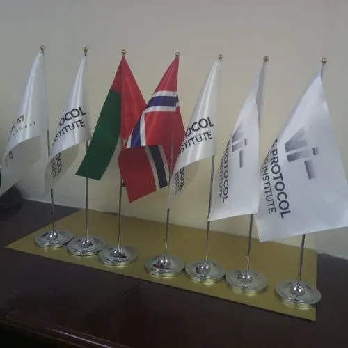 A table flag pole is matched to the selected style, with standard heights such as 38 cm and premium executive options available. The combination of durable printing, refined materials, and stable stands gives each desk flag a clean, polished, and professional appearance across the UAE. Whether for corporate branding, ceremonies, conferences, or government displays, printed table flags provide a clear and impactful desk-level presentation that gets noticed.
