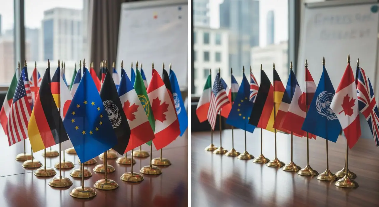 In formal and protocol-led environments, identity must be visible yet controlled. Golden table flags UAE allow company logos, national flags, and institutional symbols to be presented clearly at the table level while preserving balance and professionalism. The use of table flags with a gold base adds a refined visual cue that suits senior meetings, diplomatic discussions, and official conference settings where hierarchy and respect are closely observed.