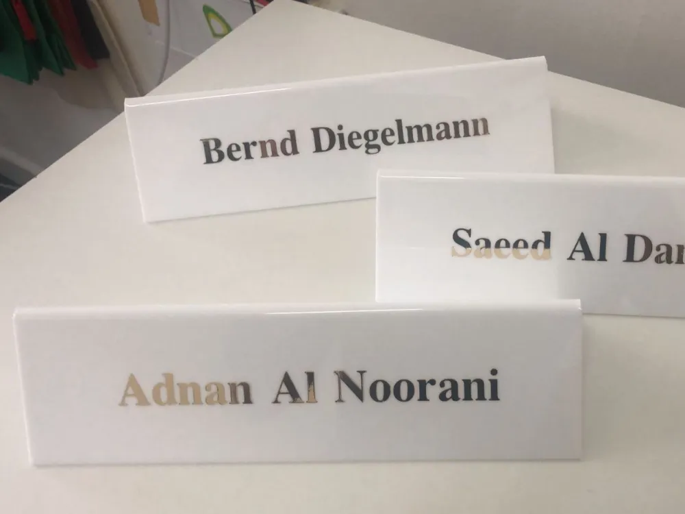 Since 2019, desk name plates for office use have been supplied to corporate offices, business centres, and professional workplaces across Dubai.