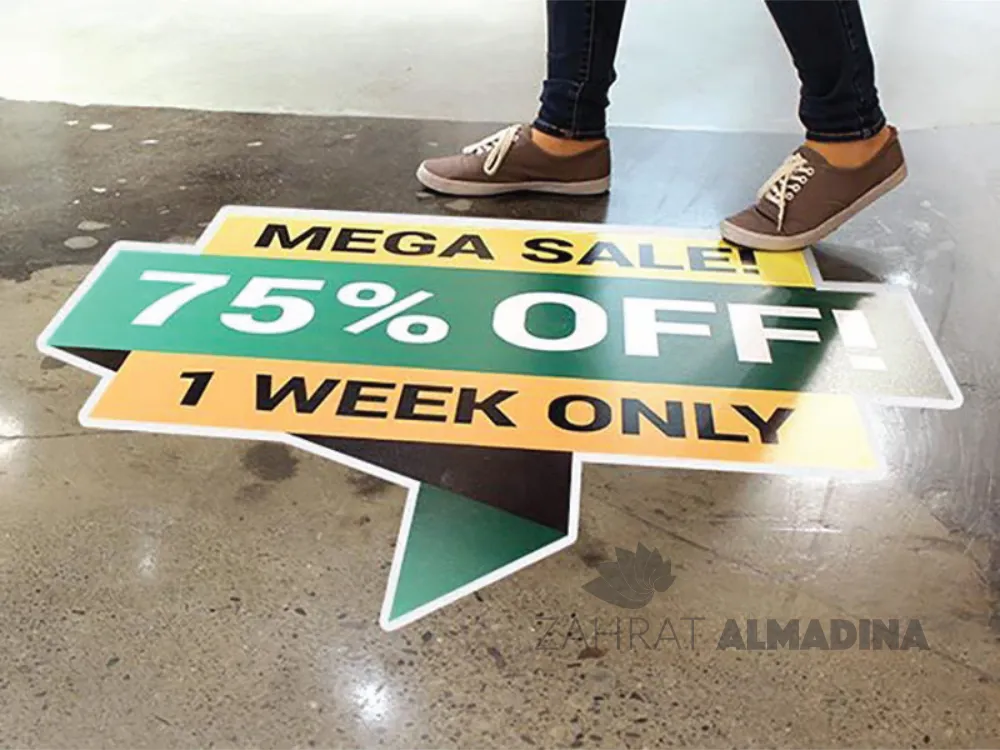 At Zahrat Al Madina Pritning, we offer custom made floor stickers for shops, malls, businesses buildings and offices in Dubai, UAE.